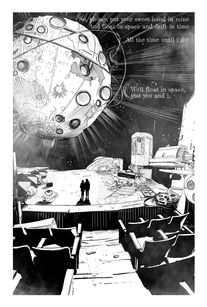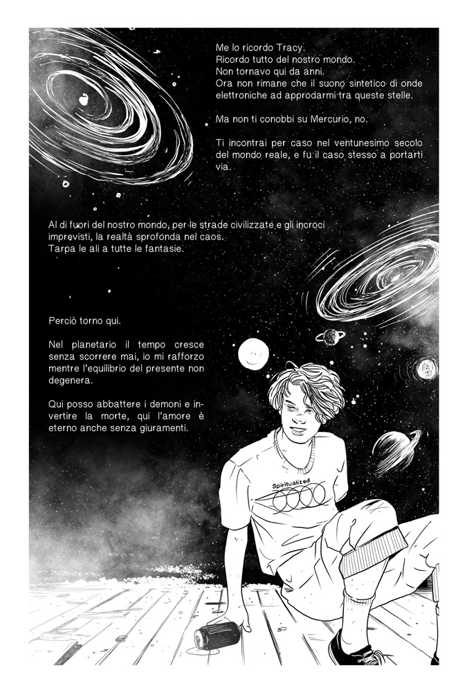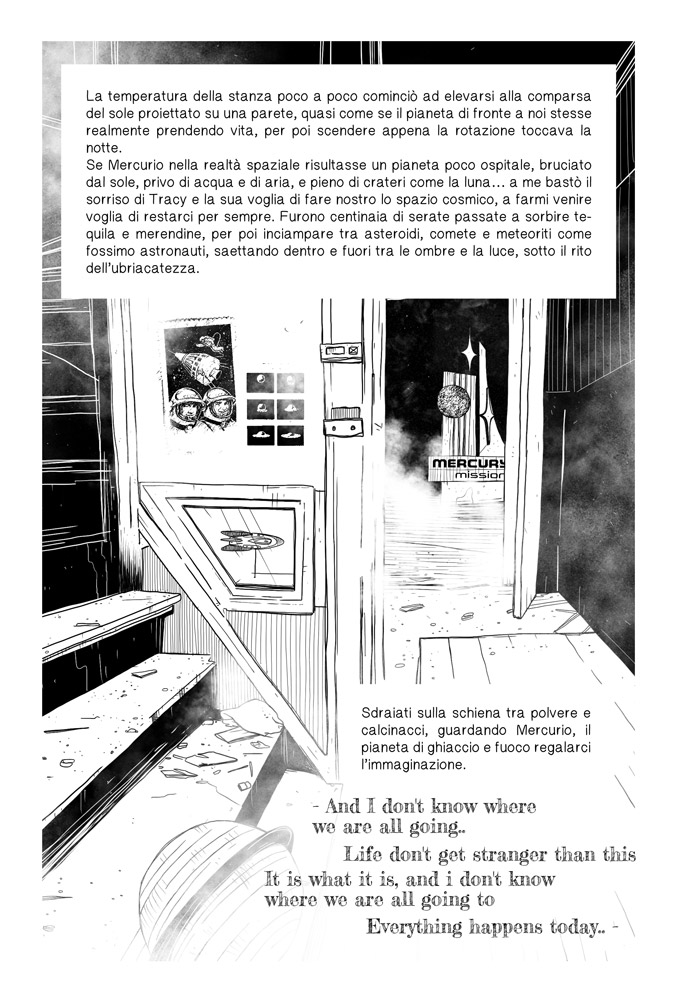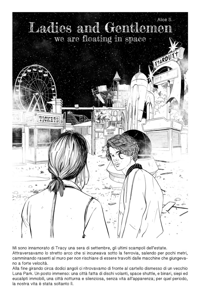 The illustrated story is born on the notes of a song by Spiritualized, from which takes its name. "Ladies and Gentlemen, we are floating in space ", it is an imaginary journey. A world